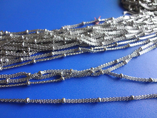 产品的形成:首饰品五金夹珠链条是用不锈钢带片经过模具成形珠子紧套在成品链条上的时尚首饰品项链条。