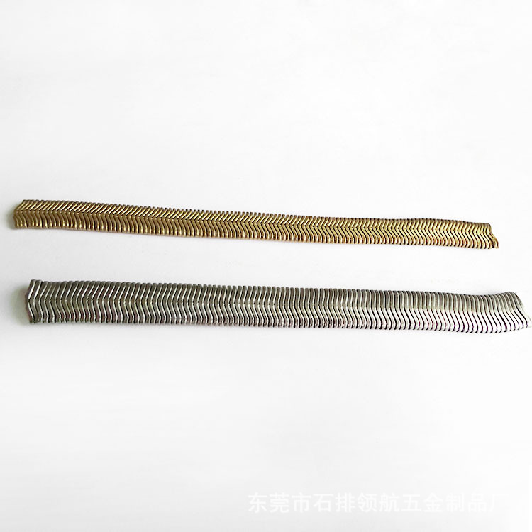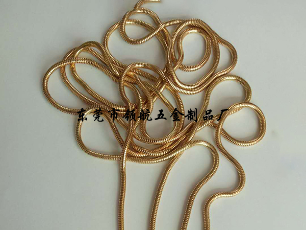 产品的形成:五金首饰品蛇链条是用铜带片,铁带片,不锈钢带片经过模具成形的时尚首饰品链条。